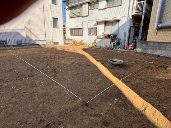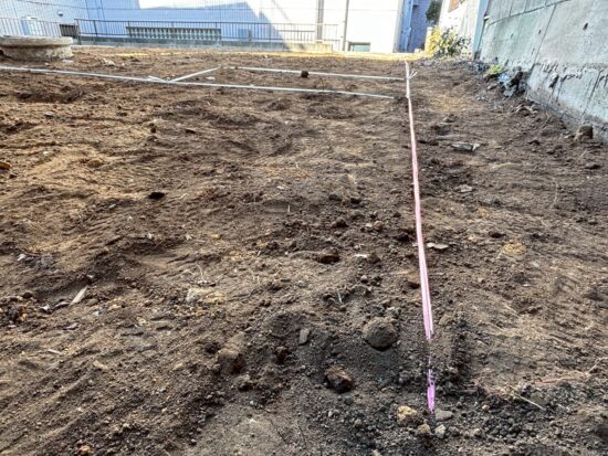 地縄張りでは、まず境界から建物の平行ラインを出す作業から始めます。