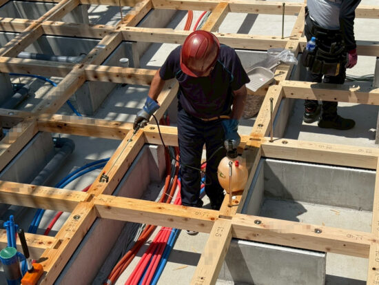 その後、隙間を気密テープでしっかり塞ぎ、最後に床材の下地となる床合板を敷いて止付けたら、