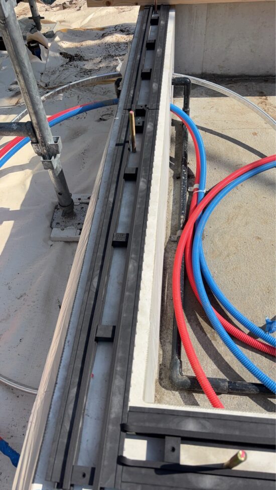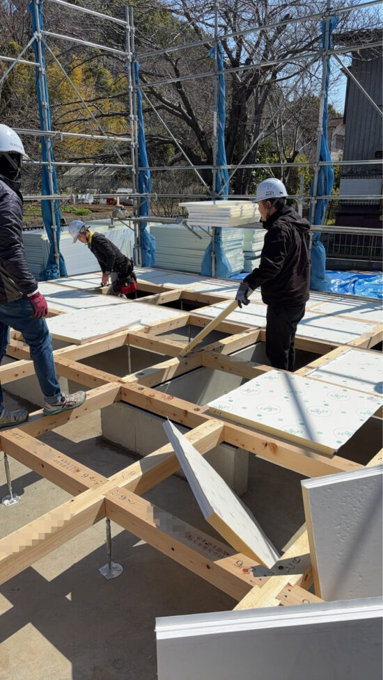 ここまで出来たら、防蟻屋さんに防蟻処理を施していただき、床下断熱材を土台のマスに落とし込んでいきます。