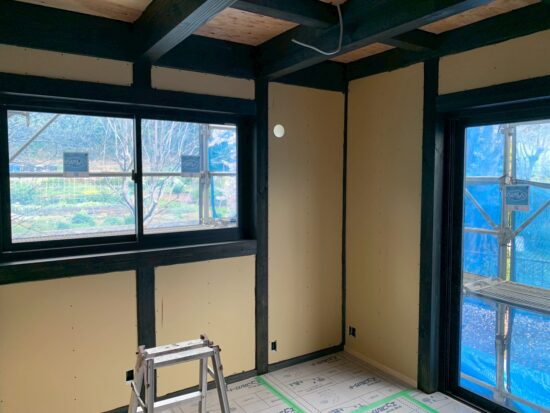 K様邸は真壁のお家となりますので、柱や梁、窓台・まぐさ、巾木などの木部は塗装をしていきます。