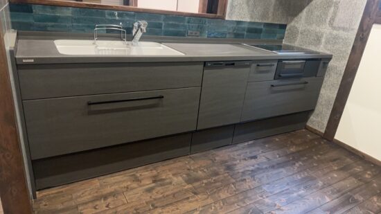 取っ手は、バー取っ手の「ブラック」、シンクは洗い場が広くとれるH2シンクの「グレー」を